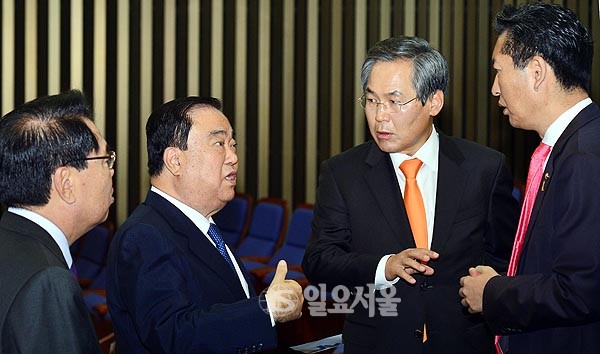 문희상 새정치민주연합 비상대책위원장, 우윤근 원내대표가 6일 서울 여의도 국회에서 열린 의원총회를 마친 후 백재현 정책위의장, 정청래 의원과 대화하고 있다.