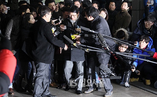박근혜 대통령의 동생 박지만 EG 회장이 15일 오후 '정윤회 국정개입 의혹' 문건 등 청와대 문건 유출사건과 관련 참고인 신분으로 조사를 받기 위해 서울 서초동 서울중앙지검에 출석하며 취재진의 질문에 답하고 있다.
