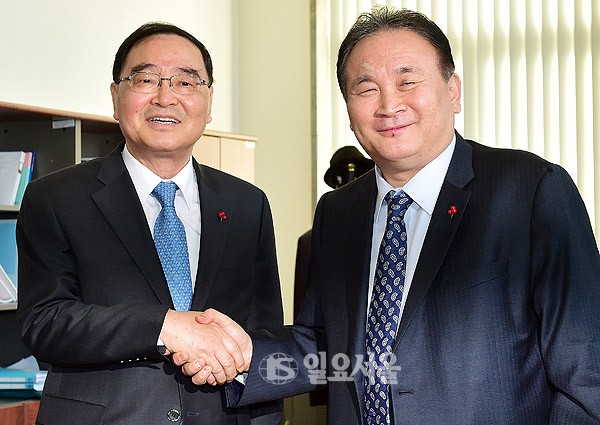 정홍원 국무총리가 7일 오전 국회 법사위원장실에서 이상민 법사위원장을 만나 악수를 나누고 있다.