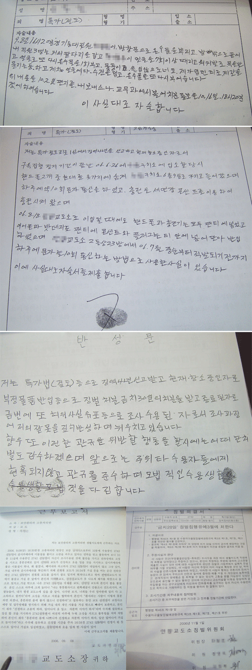 (위부터 차례대로) S씨가 2차 조사때 제출한 자필 진술서 · S씨가 작성한 휴대전화 반입 경위서 · S씨의 반성문 · S씨가 허위로 작성됐다고 주장한 C교도관의 근무보고서, 허위사실 제보 등 혐의로 S씨에게 내려진 징벌의결서