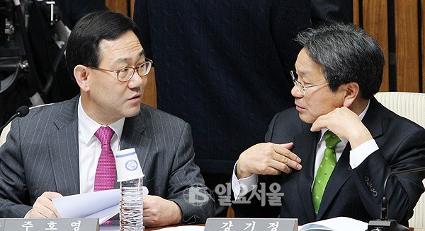 26일 오후 서울 여의도 국회에서 열린 2009년 공무원 연금개혁 평가에 관한 공청회에서 주호영 위원장과 강기정 의원이 대화를 나누고 있다.