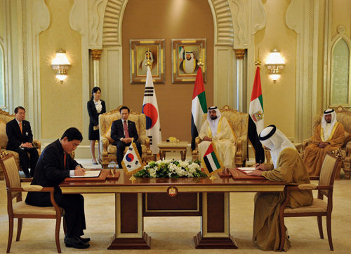 아랍에미리트(UAE)를 방문중인 이명박 대통령이 27일(현지시간) 아부다비에서 칼리파 빈 자예드 알 나흐얀 UAE대통령과 원전사업 계약 서명식을 하고 있다.
