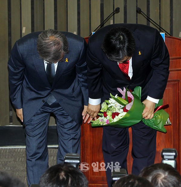 7일 국회에서 열린 새정치민주연합 제4기 원내대표 경선에서 신임원내대표로 선출된 이종걸 의원이 문재인 대표와 인사하고 있다.