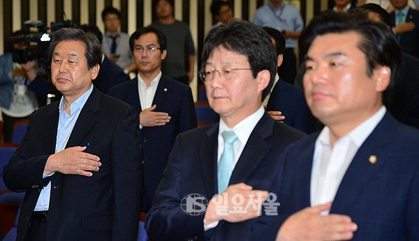 긴급의총, 국민의례하는 김무성-유승민