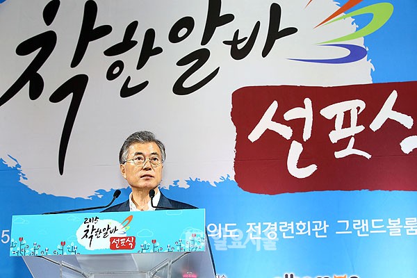 1일 서울 영등포구 여의도 전경련회관에서 열린 '2015착한알바 선포식'에 참석한 새정치민주연합 문재인 대표가 축사를 하고 있다.