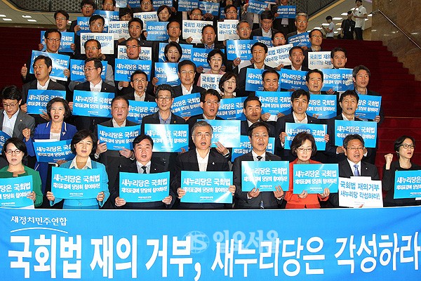 새정치민주연합 문재인 대표와 의원들이 6일 낮 서울 여의도 국회 로텐더홀 계단에서 열린 새누리당의 국회법 재의 표결 참여 촉구대회에서 구호를 외치고 있다. 정대웅 기자 photo@ilyoseoul.co.kr 저작권자 © 일요서울i 무단전재 및 재배포 금지 정대웅 기자 다른기사 보기