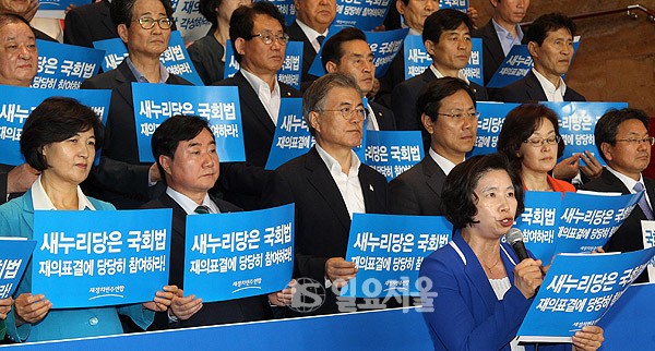 새정치민주연합 문재인 대표와 의원들이 6일 낮 서울 여의도 국회 로텐더홀 계단에서 열린 새누리당의 국회법 재의 표결 참여 촉구대회에서 구호를 외치고 있다. 정대웅 기자 photo@ilyoseoul.co.kr 저작권자 © 일요서울i 무단전재 및 재배포 금지 정대웅 기자 다른기사 보기