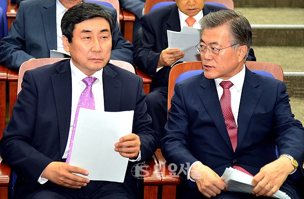 9일 오전 서울 여의도 국회에서 열린 새정치민주연합 당무위원회의에서 문재인 대표와 이종걸 원내대표가 대화 하고 있다.