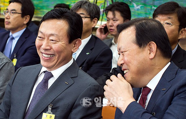 17일 서울 여의도 국회에서 열린 국회 정무위원회의 공정거래위원회에 대한 국정감사에서 신동빈 롯데그룹 회장이황각류 롯데그룹사장과 웃으며 대화를 나누고 있다.