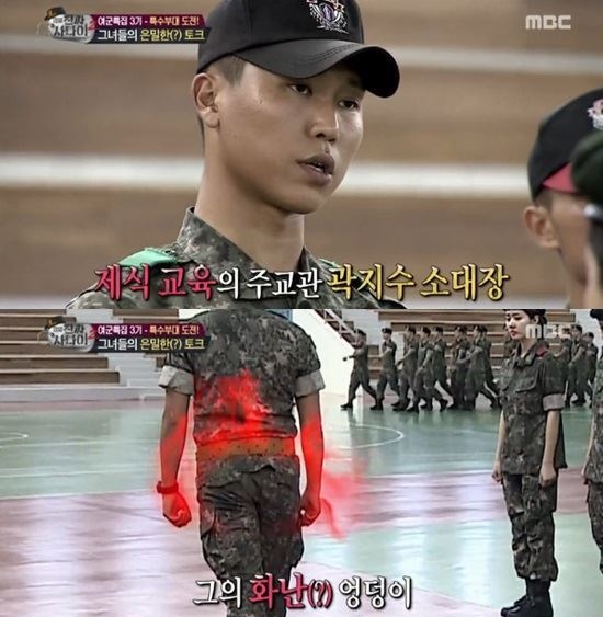 앞서 지난 6일 방송된 MBC ‘진짜 사나이여군특집 시즌3에서는 방송인 김현숙과 사유리 등이 일명 터미네이터 조교로 불렸던 곽지수 소대장의 엉덩이를 가리키며 감탄하는 장면이 등장했다.