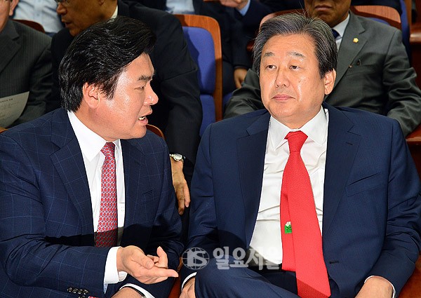 여야 대표가 합의한 '안심번호 국민공천제'를 놓고 여당 내 후폭풍이 거센 가운데 새누리당 김무성 대표와 원유철 원내대표가 30일 서울 여의도 국회에서 열린 의원총회에서 굳은 얼굴로 대화를 나누고 있다.