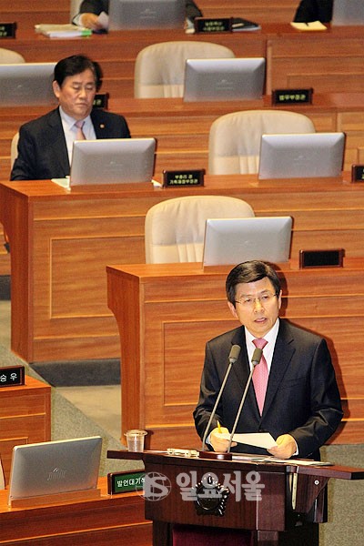 황교안 국무총리가 15일 국회에서 열린 경제분야 대정부질문에서'자위대 입국 가능' 발언과 관련해 해명하고 있다.