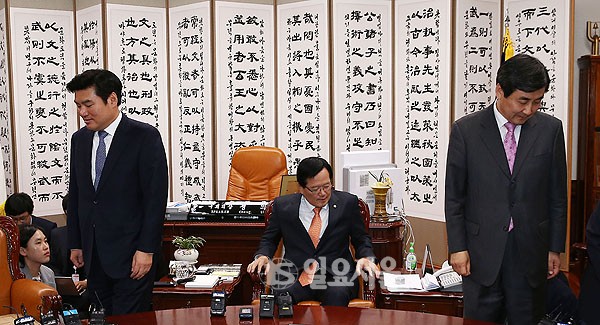 5일 정의화 국회의장이 여야 원내대표 회동을 소집하고 국회 정상화를 위한 중재에 나서고 있다.왼쪽부터 새누리당 원유철 원내대표, 정의화 국회의장, 새정치민주연합 이종걸 원내대표.