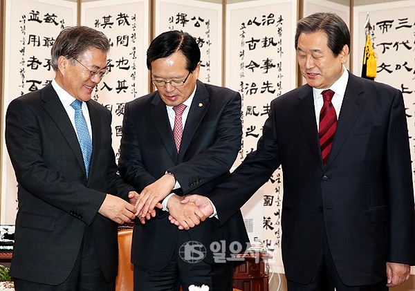 정의화 국회의장(가운데)과 새누리당 김무성(오른쪽), 새정치민주연합 문재인 대표가 9일 오후 서울 여의도 국회 의장집무실에서 만나 인사를 나누고 있다.