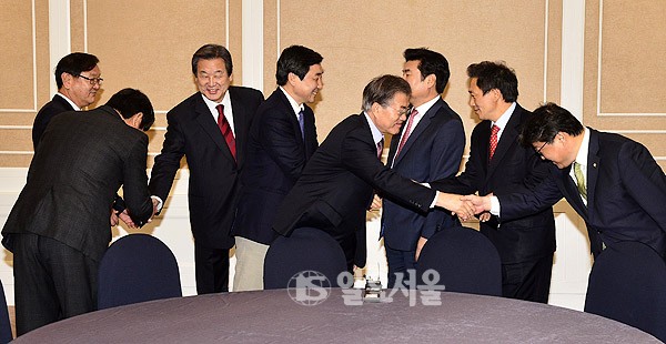 선거구획정 법정시한을 하루 남겨둔 12일 국회 의원식당에서 여야 지도부들이 삼일째‘4+4 회동' 을 열어 양당지도부들이 인사를 나누고 있다. 왼쪽부터 새정치민주연합 김태년 정개특위 간사, 이춘석 원내수석부대표,새누리당 김무성 대표, 새정치 민주연합 이종걸 원내대표, 문재인 대표, 새누리당 원유철 원내대표.이학재 정개특위 간사, 조원진 원내수석부대표.