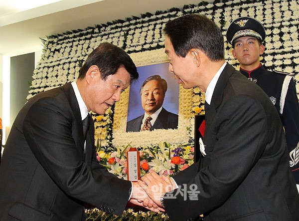 조준희 YTN 사장이 23일 서울 종로구 서울대병원 장례식장에 마련된 고 김영삼 전 대통령 빈소에 헌화한 후 김 전 대통령의 차남 현철씨를 위로하고 있다.