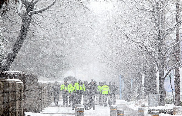 서울지역 강설량이 6cm넘는 폭설이 내린 가운데 국회의사당 앞 도로를 지나는 시민들이 거북이 걸음을 하고 있다.