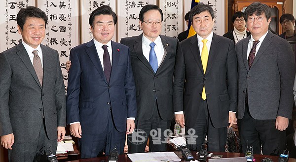 9일 오전 서울 여의도 국회에서 정의화 국회의장 주재로 진행된 정기국회 및 임시국회 의사일정 등 현안 논의를 위한 여야 원내지도부 회동에 참석한 의원들이 취재진을 향해 포즈를 취하고 있다. 왼쪽부터 유의동 새누리당 원내대변인, 원유철 원내대표, 정 의장, 이종걸 새정치민주연합 원내대표, 이춘석 원내수석부대표.