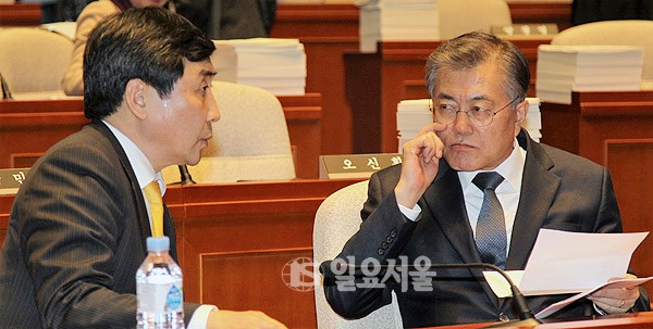 문재인 새정치민주연합 대표와 이종걸 원내대표가 9일 오후 국회에서 열린 의원총회에서 대화를 나누고 있다.
