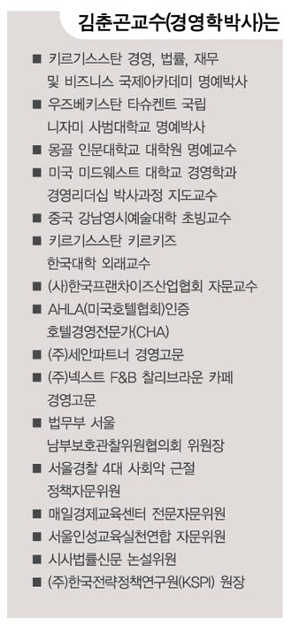 그는 “해외를 돌아다니다 보면 어떤 분야가 사업이 될지 한 눈에 보입니다.”라며, 차별화된 안목을 드러냈다. 우즈베키스탄, 키르기스스탄 뿐 아니라 러시아 시장까지 프랜차이즈 사업을 기획하고 있다며 기업가 특유의 야심찬 눈빛을 보였다. 그는 해외 외식사업 확장 뿐 아니라, 해외 친선교류와 학술연구에도 노력하고 있다. 2015년 2월 키르기스스탄을 방문하여 경영, 법률, 재무 및 비즈니스 국제아카데미(대학교)에서 명예박사를 수여받았다. 이어 6월, 우즈벡 국립 니자미 사범대학교에서 국제학술대회와 친선교류를 통하여 양국 간의 우호를 증진시킨 공로를 인정받아 국립 니자미 사범대학교로부터 명예인문학 박사를 수여받았다. 그는 작년 우즈베키스탄 타슈켄트 국립 니자미 사범대학교에서 열린 국제학술세미나에서 한국 외식산업 발전과 현황에 대한 주제발표를 하였다. 이 날 세미나에는 우즈베키스탄 교육부장관, 일본, 중국, 독일 등 각국에서 많은 교수들이 참가하였고 김 교수는 한국 외식산업의 발전과정과 현황을 외국인들이 이해하기 쉽게 설명하였다. 그는 이 날 강연을 통하여 한식에 대한 이해도를 높여 한식의 세계화에 큰 기여를 했다는 평가를 받으며. 참가자들로부터 큰 호응을 받았고 우즈베키스탄 교육부 장관으로부터 감사장을 수여받았다.