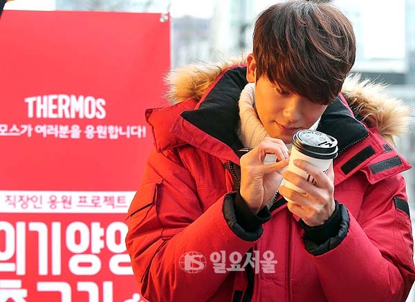 영하의 날씨가 계속된 18일 오전 글로벌 보온병 브랜드인 써모스 코리아가 서울 청계광장에서 진행한 '의기양양 출근길’ 행사에서 그룹 제국의 아이들 멤버 박형식이 출근길 직장인들에게 커피를 선물하고 있다.