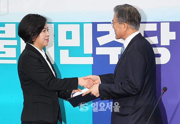고졸 출신 첫 삼성그룹 임원인 양향자 전 삼성전자 메모리사업부 플래시 개발실 상무가 12일 오전 국회 더불어민주당 당대표회의실에서 입당 원서를 문재인 대표에게 전달하고 있다.