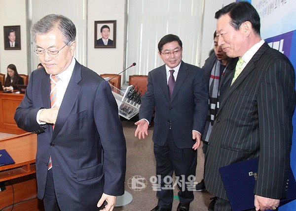 더불어민주당 문재인 대표가 14일 오전 서울 여의도 국회 당대표회의실에서 하정열 한국안보통일연구원장과 박희승 전 수원지법 안양지원장의 영입배경을 밝힌 후 회견장을 나서고 있다.