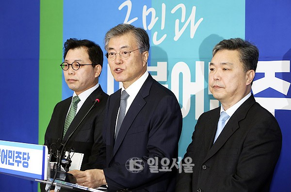문재인 더불어민주당 대표가 18일 서울 여의도 국회에서 열린 입당 기자회견에서 김민영 전 참여연대 사무처장(오른쪽), 오성규 전 서울시설관리공단 이사장을 소개하고 있다.
