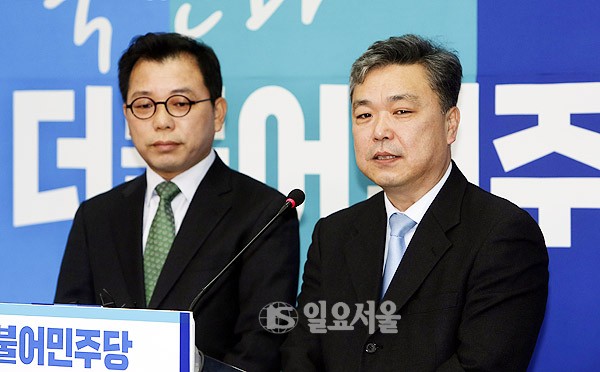 김민영 전 참여연대 사무처장(오른쪽), 오성규 전 서울시설관리공단 이사장이 18일 서울 여의도 국회에서 열린 더불어민주당 입당 기자회견에서 정치입문 포부를 밝히고 있다.