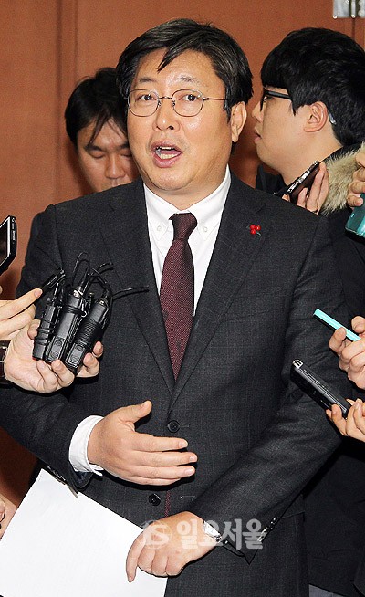 더불어민주당 이춘석 원내수석부대표가 18일 국회 정론관에서 기자회견을 열고 새누리당의 국회선진화법개정안 상정을 규탄한뒤 기자들의 질문에 답하고 있다.