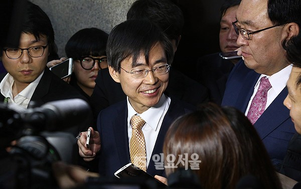 더불어민주당을 탈당한 조경태 의원이 21일 국회에서 열린 새누리당 최고위원회에 참석해 입당원서를 제출한 뒤 취재진의 질문에 답하고 있다.