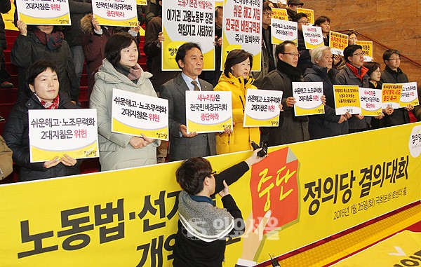 정의당 심상정 대표와 정진후 원내대표 및 의원단, 당직자 등이 26일 오전 서울 여의도 국회 로텐더홀 농성장에서 가진 노동법 개악 저지! 선거법 야합 중단 촉구! 정의당 결의대회에서 구호를 외치고 있다.