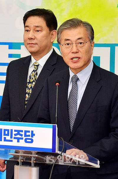 더불어민주당 문재인 대표가 26일 서울 여의도 국회에서 열린 김병기(55) 전 국가정보원 인사처장 입당 기자회견에서 인사말을 하고 있다.