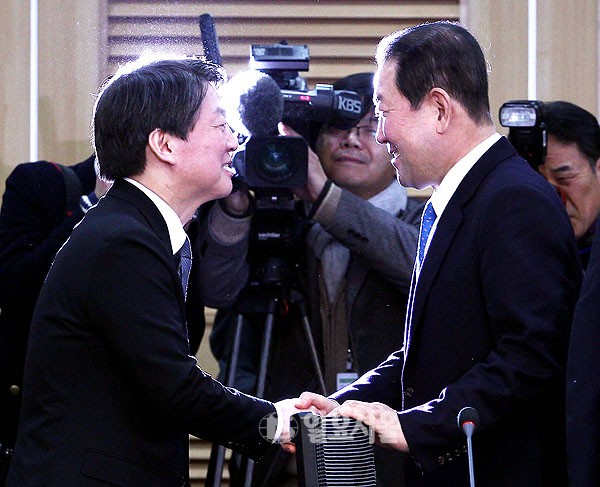 국민의당 안철수 의원과 통합신당을 추진 중인 박주선 의원이 27일 서울 여의도 국회 의원회관에서 열린 통합 기자회견을 마친 뒤 활짝 웃고 있다.