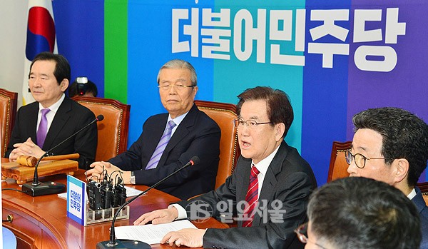 더불어민주당 김종인 비대위원장이 1일 오전 서울 여의도 국회 본청 비대위원장 회의실에서 열린 더불어성장론 정책기자회견에 참석, 강철규 유능한경제정당위원회 공동위원장의 발언을 듣고 있다.