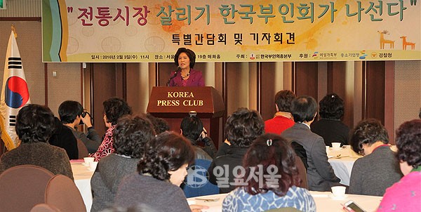 3일 오전 서울 중구 프레스센터에서 열린 '전통시장 살리기, 한국부인회가 나선다' 기자간담회에서 조태임 한국 부인회 회장이 인사말을 하고 있다.