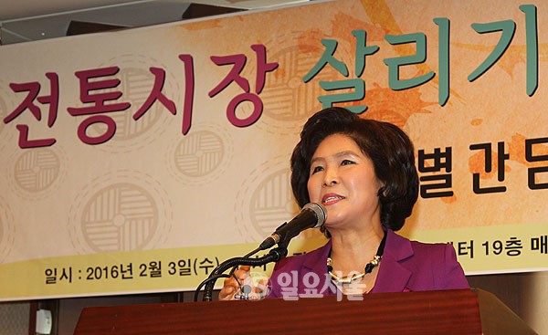 3일 오전 서울 중구 프레스센터에서 열린 '전통시장 살리기, 한국부인회가 나선다' 기자간담회에서 조태임 한국 부인회 회장이 인사말을 하고 있다.