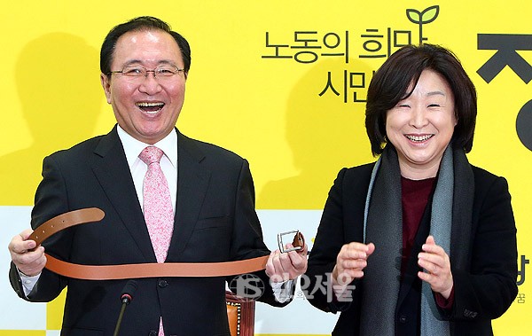 정의당 심상정대표가4일오전 서울 여의도 국회에서 열린 정의당 공동선대위원장 위촉식에서 공동 선대위원장으로 위촉된 노회찬 전 대표에게 벨트를 선물 하고 있다.