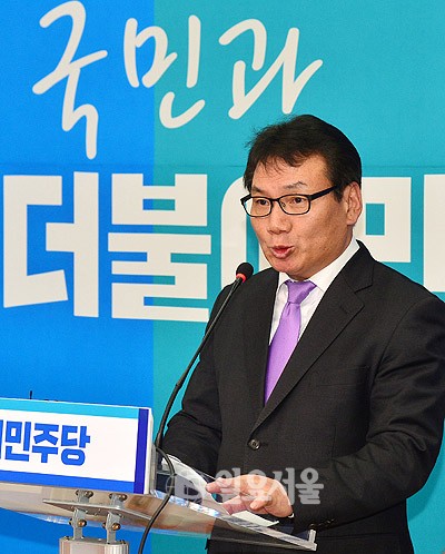 더불어민주당에 입당한 서형수 전 한겨레신문 사장이 5일 서울 여의도 국회에서 열린 입당 기자회견에서 포부를 밝히고 있다.