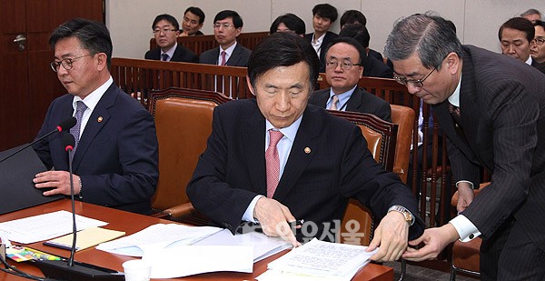 윤병세 외교부장관이 15일 서울 여의도 국회에서 열린 외교통일위원회 전체회의에서 북한 미사일 위협·개성공단 폐쇄 등과 관련한 긴급 현안보고를 마친 뒤 관계자로부터 자료를 받고있다.