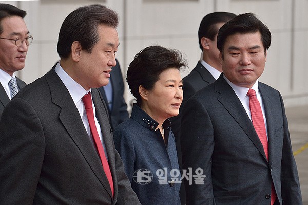 북한의 4차 핵실험 및 장거리 로켓 발사에 따른 우리 정부의 개성공단 폐쇄 이후 박근혜 대통령이 16일 오전 국회에서 ‘국정에 관한 국회연설’을 한 후 김무성 새누리당 대표와 원유철 원내대표와 함께 국회의사당을 나오고 있다.