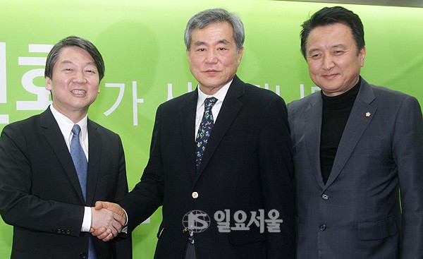 안철수 국민의당 상임공동대표와 이상돈 중앙대 명예교수가 17일 오전 서울 마포구 국민의당 당사에서 열린 인사영입 기자회견에서 인사를 나누고 있다.