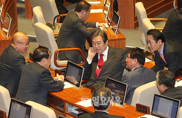 김무성 새누리당 대표가 23일 국회에서 열린 본회의에서 의원들과 심각한 표정으로 대화를 나누고 있다.