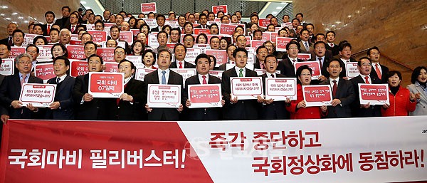새누리당 김무성 대표를 비롯한 소속의원들이29일 오후 국회 로덴다홀 계단에서 테러방지법 저지를 위한 야당의 무제한 토론이 7일째 이어지고 있는 가운데 국회마비 필리버스터 중단"과 "국회정상화에 동참하라"는 구호를 외치며 피켓 시위를 벌이고 있다.