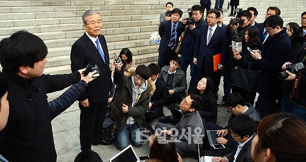 김종인 더불어민주당 비상대책위원회 대표가 3일 오전 서울 여의도 국회 본청 앞에서 시민들의 의견을 직접 청취하고 취합해 정당과 지역공약에 반영하는 '달리는 정책의자 시승식'에 참석해 취재진의 질문에 답하고 있다.