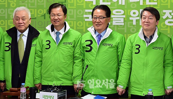 국민의당에 입당한 박지원 의원이 9일 서울 마포구 당사에서 열린 최고위원회의에 참석해 안철수, 천정배 공동대표 등과 기념촬영을 하고 있다. 왼쪽부터 , 김한길 선대위원장, 천정배 공동대표, 박 의원, 안철수 공동대표.