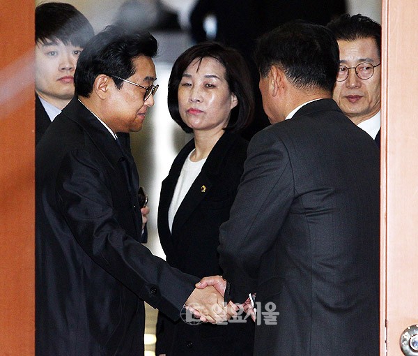 공천에서 배제된 후 재심 청구마저 기각된 전병헌 더불어민주당 의원이 17일 서울 여의도 국회에서 동작갑 지역위원회 당원들의 성명 발표 기자회견을 주선한 뒤 악수를 나누고 있다.