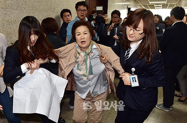 더불어민주당 실버위원회 한 당원이 21일 국회 비상대책위가 진행 중인 대표실을 찾아가 노인위원회 몫의 비례대표가 우선 순위를 받지 못한 것에 격렬하게 항의하던 중 방호직원들에 의해 끌려나오고 있다.