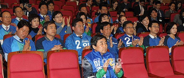 24일 서울 여의도 국회 의원회관 대회의실에서 열린 더블어 민주당 4.13 총선 공천장 수여식에서 이종걸 원내대표 등 후보자들이 김종인 대표의 인사말 도중 박수를 치고 있다.