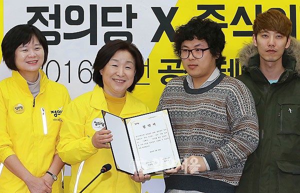 심상정 정의당 상임선대위원장과 중식이밴드가 29일 오전 서울 여의도 국회에서 20대 총선 TV광고용 영상과 공식 테마송 협약식을 체결하고 있다.